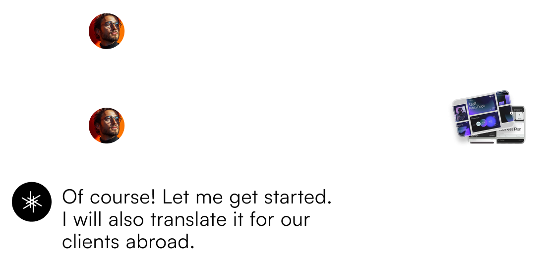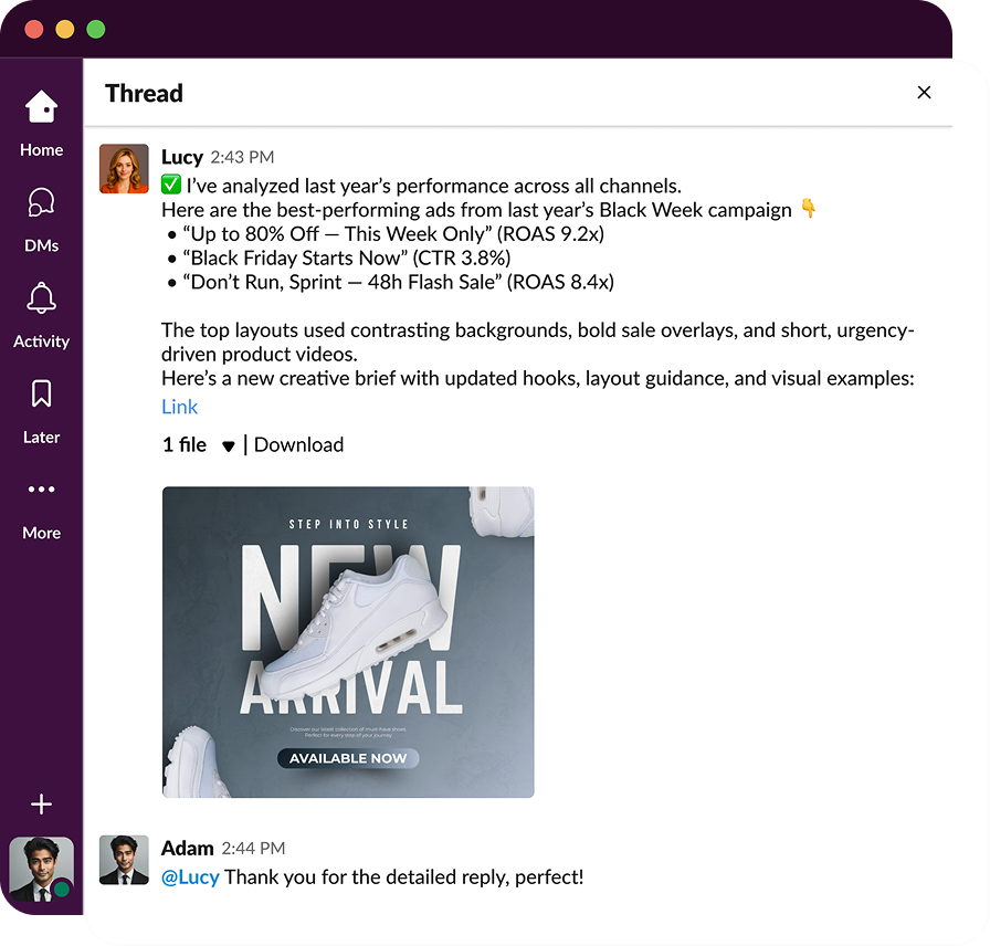 Lucy is built to act like a colleague, she works where you work. You can chat with her in Slack or email her with questions or tasks.