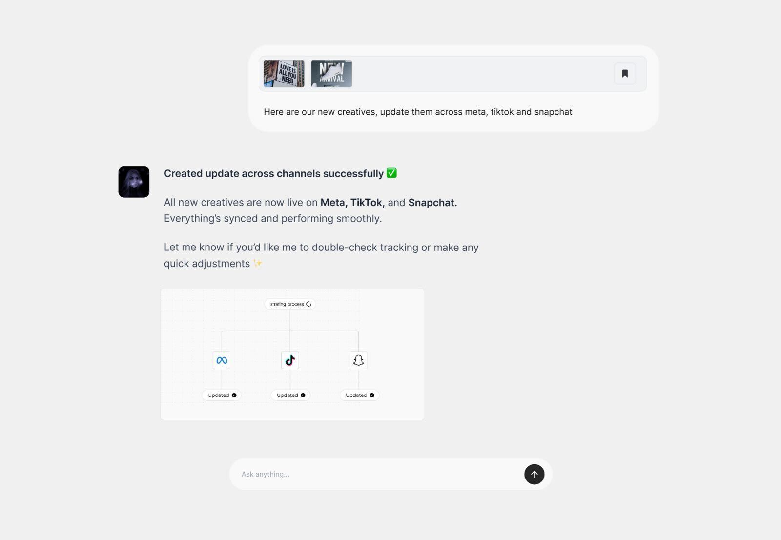 Lucy can take action across every platform — adjusting budgets, optimizing ads, and launching updates.